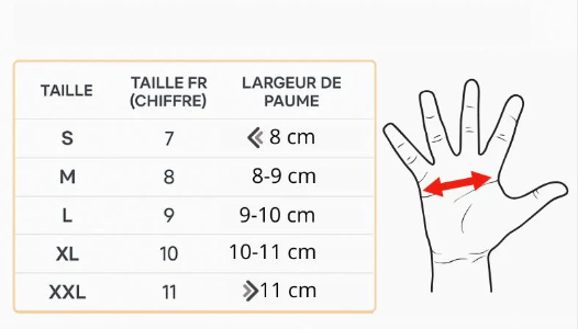 Mesurez simplement la largeur de votre paume et référez-vous au guide des tailles. Si vous êtes entre deux tailles, choisissez la plus grande pour un confort optimal.